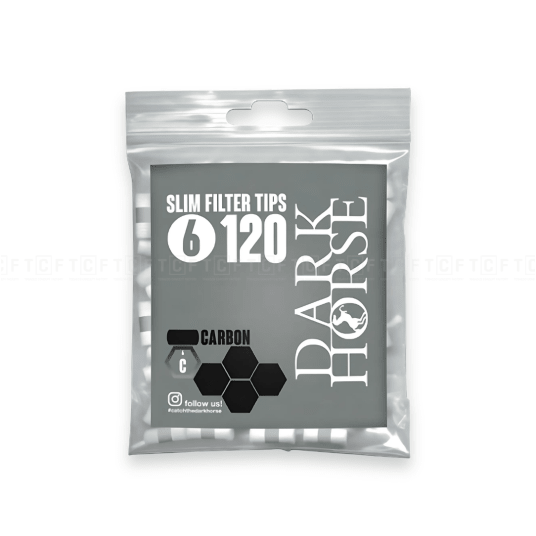 Dark Horse Slim Carbonto cienkie węglowe filtry do skręcania papierosów. Każde opakowanie zawiera 120 filtrów o średnicy6 mm i długości 15 mm.Węgiel aktywny w filtrach skutecznie oczyszcza dym, zapewniając przyjemniejszy smak.