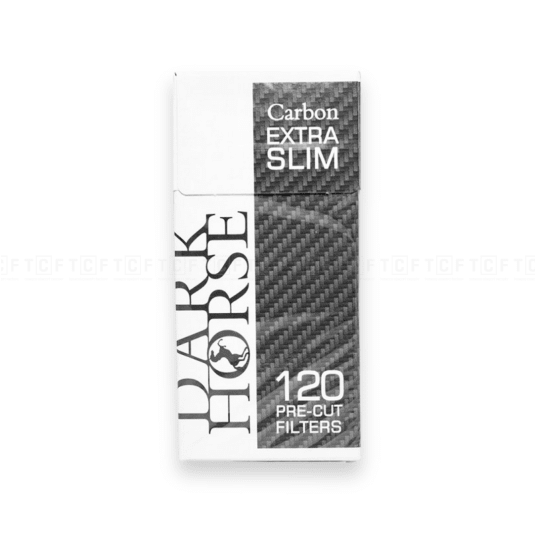 Dark Horse Extra SlimCarbon Pre-Cutto wstępnie przycięte filtry w patyczkach (po 6 filtrów) dostępne w poręcznych kartonowych pudełkach, znacznie bardziej kompaktowych niż inne opcje. Każde opakowanie zawiera 120 ultracienkichfiltrów o średnicy 5,7 mm i długości 14 mm. Węgiel aktywny w filtrach skutecznie oczyszcza dym, zapewniając przyjemniejszy smak.