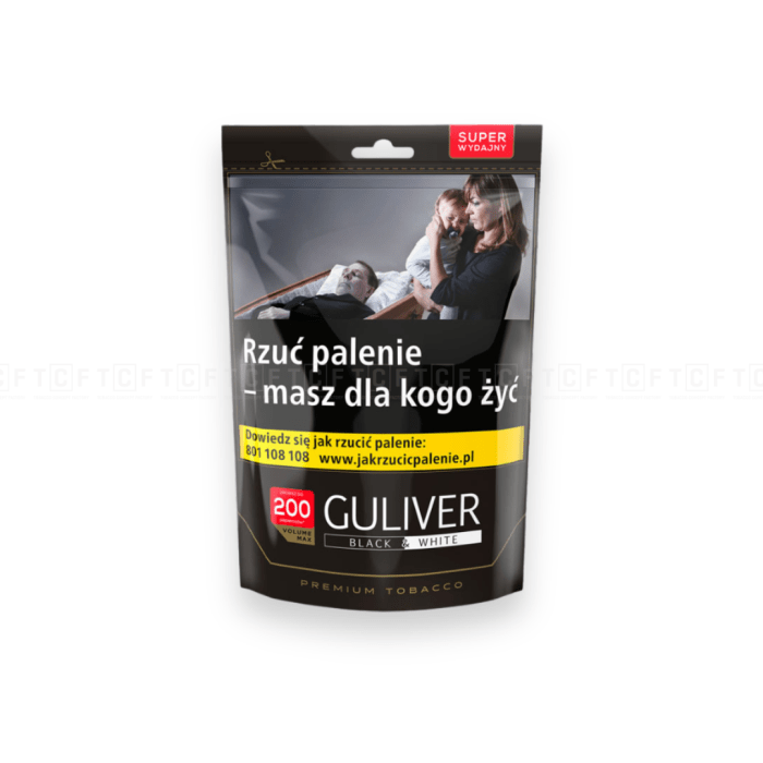 Tytoń Guliwer Black&White to wysokiej jakości naturalna kompozycja starannie wyselekcjonowanych tytoni. Zastosowanie technologii volume max pozwala na wykonanie większej ilości papierosów.