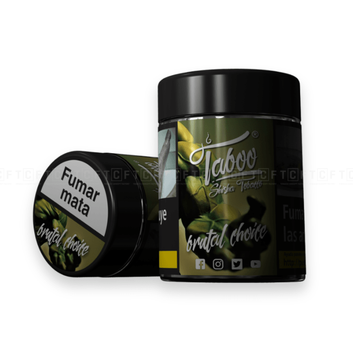TABOO Brutal Choice to odmiana tytoniu do fajki wodnej, wyróżniająca się wyłącznie świeżym smakiem mięty. Produkt jest dostępny w opakowaniu o pojemności 50g. Charakteryzuje się intensywnym i orzeźwiającym aromatem mięty, idealnym dla miłośników prostych, jednak mocnych i przyjemnych doznań podczas palenia fajki wodnej.