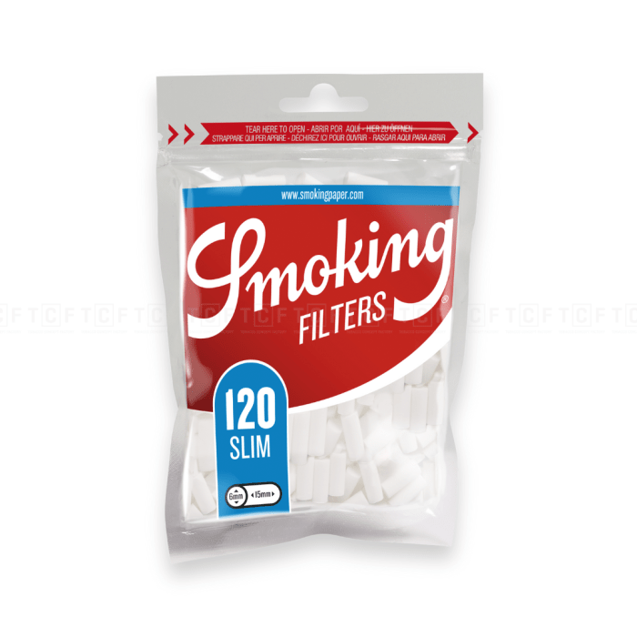 Filtry Smoking Classic Slimmają średnicę 6 mm i długość15 mm. Każde opakowanie zawiera 120 powlekanych papierem filtrów.